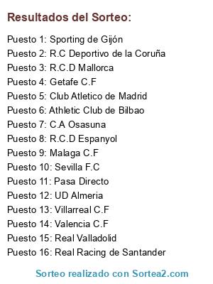 Lista de participantes: Athletic Club de Bilbao, Malaga C.F, R.C Deportivo de la Coruña, R.C.D Espanyol, Getafe C.F, Real Valladolid, Club Atletico de Madrid, R.C.D Mallorca, C.A Osasuna, Real Racing de Santander, UD Almeria, Sevilla F.C, Valencia C.F, Villarreal C.F, Sporting de Gijón, Pasa Directo.