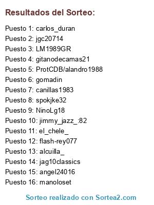 Lista de participantes: gomadin, angel24016, flash-rey077, spokjke32, manoloset, gitanodecamas21, el_chele_, alcuilla_, jag10classics, LM1989GR, canillas1983, NinoLg18, carlos_duran, jimmy_jazz_:82, ProtCDB/alandro1988, jgc20714.