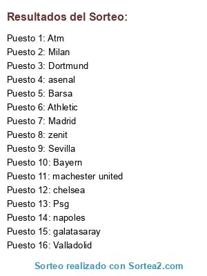 Lista de participantes: Madrid, Bayern, Atm, Psg, Barsa, Dortmund, Sevilla, chelsea, machester united, asenal , napoles, Milan, zenit, galatasaray, Valladolid, Athletic.