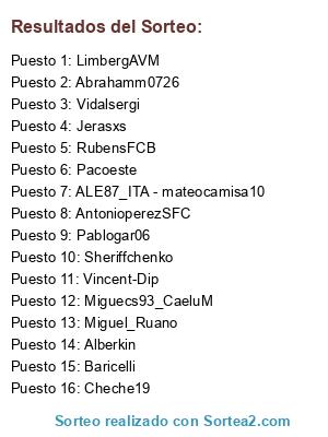 Lista de participantes: Miguel_Ruano, Jerasxs, AntonioperezSFC, Abrahamm0726, Vidalsergi, Vincent-Dip, ALE87_ITA - mateocamisa10, Pablogar06, Pacoeste, Cheche19, Miguecs93_CaeluM, Baricelli, Alberkin, LimbergAVM, RubensFCB, Sheriffchenko.