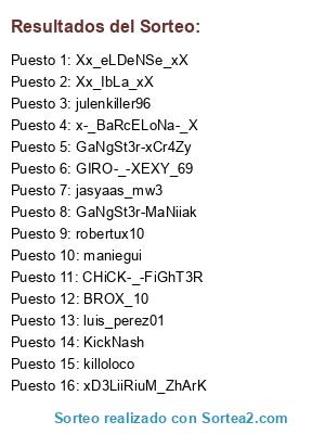 Lista de participantes: BROX_10, Xx_eLDeNSe_xX, x-_BaRcELoNa-_X, GaNgSt3r-MaNiiak, GIRO-_-XEXY_69, CHiCK-_-FiGhT3R, luis_perez01, Xx_IbLa_xX, maniegui, julenkiller96, xD3LiiRiuM_ZhArK, killoloco, jasyaas_mw3, GaNgSt3r-xCr4Zy, KickNash, robertux10.