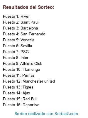 Lista de participantes: Inter, San Fernando, River, Venezia, Manchester united, Tigres, Barcelona, Deportivo, PSG, Saint Pauli, Red Bull, Pumas, Flamengo, Sevilla, Athletic Club, Ajax.