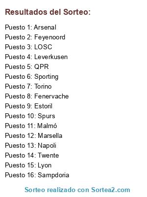 Lista de participantes: Torino, Lyon, Spurs, Feyenoord, Estoril, QPR, Sampdoria, Twente, Napoli, LOSC, Marsella, Malmó, Fenervache, Leverkusen, Arsenal, Sporting.