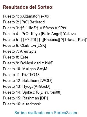 Lista de participantes: Clark Evil[LSK], Spike3:16[Disturbio08], Batalliom(LWOD), ††H?d?S†† [[Phoenix]] ?[Tríada -Ken]?, ĐoИαsLoяđ † ИФĐ, -PrO- Kiryu [Falle Angel] Yakuza, Maligno-SVyM-, alitadmosk, Este, Rashman [DP], Hyoga(A-GooD), †£ ' ШøĐ† ¤ Sfarss ¤ 9Pts, [Pr0] Betikadd, xXxamatorijexXx, RizThO18, Ares 2pts.