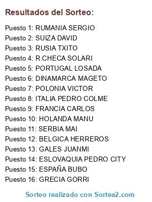 Lista de participantes: HOLANDA MANU, POLONIA VICTOR, BELGICA HERREROS, SUIZA DAVID, DINAMARCA MAGETO, R.CHECA SOLARI, SERBIA MAI, ESLOVAQUIA PEDRO CITY, RUMANIA SERGIO, GALES JUANMI, FRANCIA CARLOS, ESPAÑA BUBO, RUSIA TXITO, GRECIA GORRI, ITALIA PEDRO COLME, PORTUGAL LOSADA.