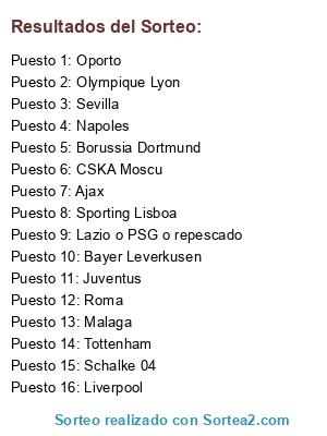 Lista de participantes: Tottenham, Ajax, Sporting Lisboa, Schalke 04, Juventus, Sevilla, Oporto, Liverpool, Lazio o PSG o repescado, Roma, Napoles, Borussia Dortmund, Malaga, CSKA Moscu, Bayer Leverkusen, Olympique Lyon.