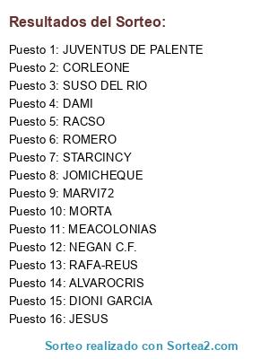 Lista de participantes: NEGAN C.F., RAFA-REUS, RACSO, MARVI72, ROMERO, DAMI, JESUS, STARCINCY, MORTA, DIONI GARCIA, ALVAROCRIS, MEACOLONIAS, SUSO DEL RIO, CORLEONE, JUVENTUS DE PALENTE, JOMICHEQUE.