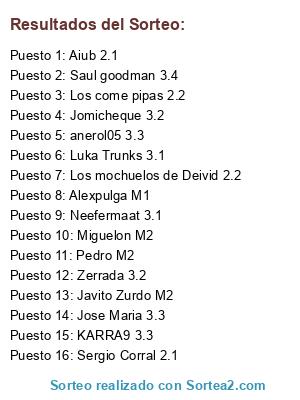 Lista de participantes: Pedro M2, Alexpulga M1, Saul goodman 3.4, Luka Trunks 3.1, KARRA9 3.3, Sergio Corral 2.1, Jose Maria 3.3, anerol05 3.3, Zerrada 3.2, Miguelon M2, Aiub 2.1, Los mochuelos de Deivid 2.2, Los come pipas 2.2, Javito Zurdo M2, Jomicheque 3.2, Neefermaat 3.1.