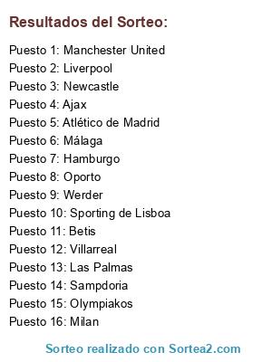 Lista de participantes: Manchester United, Olympiakos, Atlético de Madrid, Sporting de Lisboa, Betis, Sampdoria, Hamburgo, Málaga, Las Palmas, Villarreal, Ajax, Newcastle, Milan, Oporto, Werder, Liverpool.