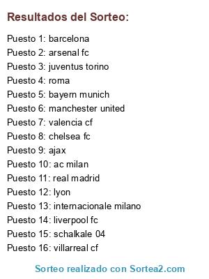 Lista de participantes: barcelona, arsenal fc, schalkale 04, liverpool fc, manchester united, real madrid, chelsea fc, internacionale milano, juventus torino, valencia cf, bayern munich, ajax, lyon, ac milan, villarreal cf, roma.