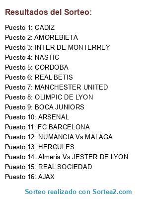Lista de participantes: HERCULES, NUMANCIA Vs MALAGA, OLIMPIC DE LYON, CADIZ, CORDOBA, AJAX, INTER DE MONTERREY, Almeria Vs JESTER DE LYON, REAL SOCIEDAD, MANCHESTER UNITED, FC BARCELONA, BOCA JUNIORS, ARSENAL, REAL BETIS, AMOREBIETA, NASTIC.