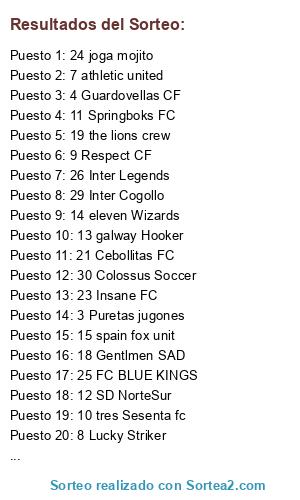 Lista de participantes: 1 La Hermandad , 2 Devil Cry FC , 3 Puretas jugones , 4 Guardovellas CF , 5 Galaxy Shadow , 6 Weed Stars FC , 7 athletic united , 8 Lucky Striker , 9 Respect CF, 10 tres Sesenta fc , 11 Springboks FC , 12 SD NorteSur , 13 galway Hooker , 14 eleven Wizards , 15 spain fox unit , 16 inthesky , 17 Revival TF , 18 Gentlmen SAD , 19 the lions crew , 20 Lethal Army , 21 Cebollitas FC , 22 Ladillas danone , 23 Insane FC , 24 joga mojito, 25 FC BLUE KINGS, 26 Inter Legends, 27 Ferrol HotSpur, 28 Spanish style , 29 Inter Cogollo, 30 Colossus Soccer, 31 rcd legend , 32 Los Borderlains.