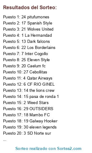 Lista de participantes: 1 La Hermandad, 2 Weed Stars, 3 SD Norte sur, 4 Qatar Airways , 5 Joga Bonitoo, 6 CF RIO GINEL, 7 Inter Cogollo , 8 Ferrol Hotspur, 9 Golden Spain, 10 galaxy shadow, 11 Eleven Wizards, 12 InTheSky, 13 Dark falcons, 14 the lions crew, 15 pasa de ronda 1, 16 Devil Cry, 17 Spanish Style, 18 Mambo FC, 19 Galway Hooker, 20 Caelum fc, 21 Wolves United, 22 Los Borderlains, 23 Revival tf, 24 pitufumones, 25 Eleven Style, 26 TacticalBoard, 27 Cebollitas, 28 Lucky Striker, 29 OUTSIDERS, 30 eleven legends, 31 Insane FC, 32 pasa de ronda 2.