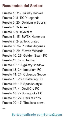 Lista de participantes: 1- La Hermandad, 2- athletic united, 3- Arise Fc, 4- Devil Cry FC, 5- Pitufumones, 6- InTheSky, 7- Springboks FC, 8- RCD Legends, 9- revival tf, 10- galaxy shadow, 11- Ferrol Hotspur, 12- Lucky Striker, 13- Eleven Style, 14- Insane FC, 15- BW3X Hammers, 16- Lethal Army, 17- The lions crew, 18- Gentlmen SAD, 19- Spanish style, 20- Delirium e-Sports, 21- Colossus Soccer, 22- TacticalBoard, 23- Raptors United, 24- Imperium FC, 25- Golden Spain FC, 26- Puretas Jugones, 27- Dark falcons, 28- Shattering FC, 29- Eleven Wizards, 30- ChiringuitoBull, 31- Galway Hooker, 32- Follatores CF.
