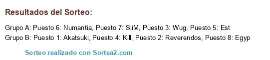 Lista de participantes: Puesto 1: Akatsuki, Puesto 2: Reverendos, Puesto 3: Wug, Puesto 4: Kill, Puesto 5: Est, Puesto 6: Numantia, Puesto 7: SiiM, Puesto 8: Egyp.