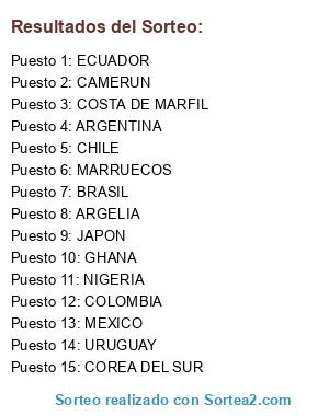 Lista de participantes: CAMERUN, COSTA DE MARFIL, NIGERIA, GHANA, BRASIL, MEXICO, CHILE, COLOMBIA, URUGUAY, ARGENTINA, MARRUECOS, ECUADOR, JAPON, COREA DEL SUR, ARGELIA.