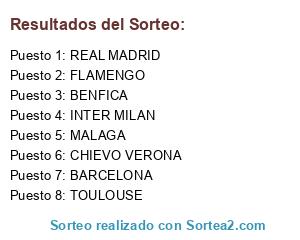 Lista de participantes: FLAMENGO, MALAGA, REAL MADRID, BENFICA, BARCELONA, CHIEVO VERONA, TOULOUSE, INTER MILAN.