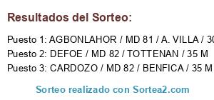 Lista de participantes: AGBONLAHOR / MD 81 / A. VILLA / 30 M, DEFOE / MD 82 / TOTTENAN / 35 M, CARDOZO / MD 82 / BENFICA / 35 M.
