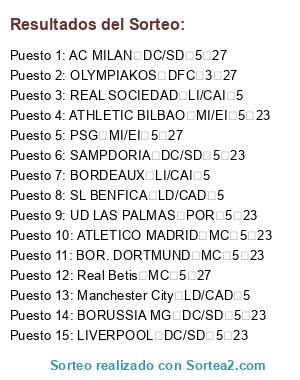 Lista de participantes: UD LAS PALMAS POR 5 23, BOR. DORTMUND MC 5 23, BORUSSIA MG DC/SD 5 23, Manchester City LD/CAD 5, ATLETICO MADRID MC 5 23, REAL SOCIEDAD LI/CAI 5, SL BENFICA LD/CAD 5, PSG MI/EI 5 27, SAMPDORIA DC/SD 5 23, Real Betis MC 5 27, OLYMPIAKOS DFC 3 27, ATHLETIC BILBAO MI/EI 5 23, BORDEAUX LI/CAI 5, AC MILAN DC/SD 5 27, LIVERPOOL DC/SD 5 23.