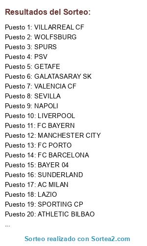 Lista de participantes: FIORENTINA, FC BAYERN, OLYMPIAKOS, SAMPDORIA, VILLARREAL CF, MANCHESTER UTD, ARSENAL, SL BENFICA, ATHLETIC BILBAO, AC MILAN, INTER, A. VILLA, AT. OSASUNA, BAYER 04, NAPOLI, NEWCASTLE UTD, GALATASARAY SK, ATLETICO MADRID, FC BARCELONA, AJAX, SUNDERLAND, VALENCIA CF, WOLFSBURG, HAMBURGER SV, LAZIO, MANCHESTER CITY, LIVERPOOL, SEVILLA, GETAFE, FC PORTO, SPURS, PANATHINAIKOS, PSV, SPORTING CP.