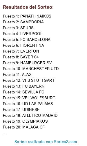 Lista de participantes: FIORENTINA, VFL WOLFSBURG, FC BARCELONA, OLYMPIAKOS, ARSENAL, R. SPORTING, MALAGA CF, GALATASARAY SK, UDINESE, ATLETICO MADRID, EVERTON, GETAFE CF, HAMBURGER SV, SUNDERLAND, VALENCIA CF, AJAX, INTER, VFB STUTTGART, FC PORTO, NAPOLI, FC BAYERN, PSG, VILLARREAL CF, PANATHINAIKOS, BORDEAUX, MARSEILLE, LEEDS UNITED, SEVILLA FC, SAMPDORIA, MANCHESTER UTD, AT. OSASUNA, UD LAS PALMAS, SPURS, BAYER 04, LIVERPOOL.