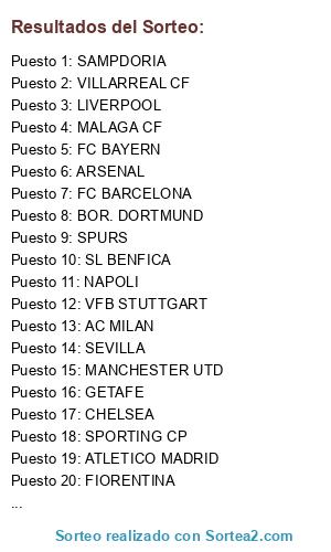 Lista de participantes: SEVILLA, SPURS, SAMPDORIA, AC MILAN, CHELSEA, VALENCIA CF, OLYMPIAKOS, GETAFE, FC PORTO, FC BARCELONA, SL BENFICA, SPORTING CP, VFB STUTTGART, LEEDS UNITED, PANATHINAIKOS, GALATASARAY SK, ATLETICO MADRID, NAPOLI, MANCHESTER UTD, VILLARREAL CF, BOR. DORTMUND, MALAGA CF, FC BAYERN, WERDER BREMEN, ARSENAL, GENOA, FIORENTINA, LIVERPOOL.