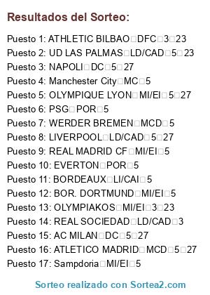 Lista de participantes: NAPOLI DC 5 27, LIVERPOOL LD/CAD 5 27, EVERTON POR 5, AC MILAN DC 5 27, PSG POR 5, REAL SOCIEDAD LD/CAD 3, BORDEAUX LI/CAI 5, BOR. DORTMUND MI/EI 5, REAL MADRID CF MI/EI 5, WERDER BREMEN MCD 5, Manchester City MC 5, ATLETICO MADRID MCD 5 27, OLYMPIQUE LYON MI/EI 5 27, OLYMPIAKOS MI/EI 3 23, UD LAS PALMAS LD/CAD 5 23, Sampdoria MI/EI 5, ATHLETIC BILBAO DFC 3 23.