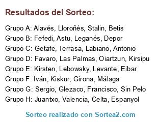 Lista de participantes: Valencia, Getafe, Girona, Leganés, Alavés, Espanyol, Betis, Celta, Depor, Eibar, Levante, Las Palmas, Málaga, Oiartzun, Sergio, Lebowsky, Kirsipu, Antonio, Juantxo, Favaro, Fefedi, Astu, Terrasa, Glezaco, Sin Pelo, Francisco, Iván, Stalin, Lloroñés, Labiano, Kiskur, Kirsten.