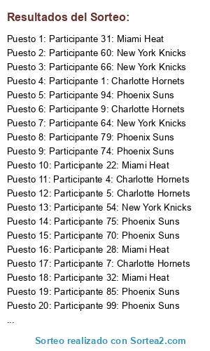 Lista de participantes: Participante 1: Charlotte Hornets, Participante 2: Charlotte Hornets, Participante 3: Charlotte Hornets, Participante 4: Charlotte Hornets, Participante 5: Charlotte Hornets, Participante 6: Charlotte Hornets, Participante 7: Charlotte Hornets, Participante 8: Charlotte Hornets, Participante 9: Charlotte Hornets, Participante 10: Charlotte Hornets, Participante 11: Charlotte Hornets, Participante 12: Charlotte Hornets, Participante 13: Charlotte Hornets, Participante 14: Charlotte Hornets, Participante 15: Charlotte Hornets, Participante 16: Charlotte Hornets, Participante 17: Charlotte Hornets, Participante 18: Miami Heat, Participante 19: Miami Heat, Participante 20: Miami Heat, Participante 21: Miami Heat, Participante 22: Miami Heat, Participante 23: Miami Heat, Participante 24: Miami Heat, Participante 25: Miami Heat, Participante 26: Miami Heat, Participante 27: Miami Heat, Participante 28: Miami Heat, Participante 29: Miami Heat, Participante 30: Miami Heat, Participante 31: Miami Heat, Participante 32: Miami Heat, Participante 33: Miami Heat, Participante 34: Miami Heat, Participante 35: Miami Heat, Participante 36: Miami Heat, Participante 37: Miami Heat, Participante 38: Miami Heat, Participante 39: Miami Heat, Participante 40: Miami Heat, Participante 41: Miami Heat, Participante 42: Miami Heat, Participante 43: Miami Heat, Participante 44: Miami Heat, Participante 45: Miami Heat, Participante 46: Miami Heat, Participante 47: Miami Heat, Participante 48: Miami Heat, Participante 49: Miami Heat, Participante 50: Miami Heat, Participante 51: New York Knicks, Participante 52: New York Knicks, Participante 53: New York Knicks, Participante 54: New York Knicks, Participante 55: New York Knicks, Participante 56: New York Knicks, Participante 57: New York Knicks, Participante 58: New York Knicks, Participante 59: New York Knicks, Participante 60: New York Knicks, Participante 61: New York Knicks, Participante 62: New York Knicks, Participante 63: New York Knicks, Participante 64: New York Knicks, Participante 65: New York Knicks, Participante 66: New York Knicks, Participante 67: New York Knicks, Participante 68: Phoenix Suns, Participante 69: Phoenix Suns, Participante 70: Phoenix Suns, Participante 71: Phoenix Suns, Participante 72: Phoenix Suns, Participante 73: Phoenix Suns, Participante 74: Phoenix Suns, Participante 75: Phoenix Suns, Participante 76: Phoenix Suns, Participante 77: Phoenix Suns, Participante 78: Phoenix Suns, Participante 79: Phoenix Suns, Participante 80: Phoenix Suns, Participante 81: Phoenix Suns, Participante 82: Phoenix Suns, Participante 83: Phoenix Suns, Participante 84: Phoenix Suns, Participante 85: Phoenix Suns, Participante 86: Phoenix Suns, Participante 87: Phoenix Suns, Participante 88: Phoenix Suns, Participante 89: Phoenix Suns, Participante 90: Phoenix Suns, Participante 91: Phoenix Suns, Participante 92: Phoenix Suns, Participante 93: Phoenix Suns, Participante 94: Phoenix Suns, Participante 95: Phoenix Suns, Participante 96: Phoenix Suns, Participante 97: Phoenix Suns, Participante 98: Phoenix Suns, Participante 99: Phoenix Suns, Participante 100: Phoenix Suns.