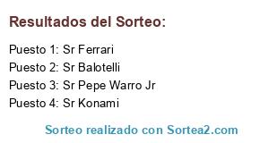 Lista de participantes: Sr Konami, Sr Ferrari, Sr Balotelli, Sr Pepe Warro Jr.