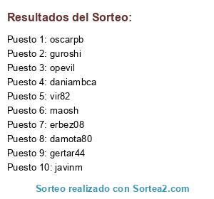 Lista de participantes: damota80, oscarpb, daniambca, gertar44, opevil, erbez08, maosh, javinm, vir82, guroshi.