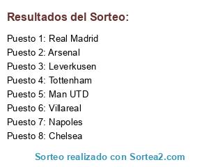 Lista de participantes: Man UTD, Real Madrid, Napoles, Villareal, Tottenham, Leverkusen, Arsenal, Chelsea.