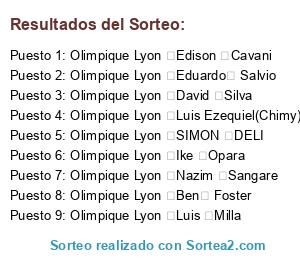 Lista de participantes: Olimpique Lyon FRANCIS COQUELIN, Olimpique Lyon Julio Alberto Buffarini, Olimpique Lyon Samuel Umtiti, Olimpique Lyon Emmanuel Okyere Boateng, Olimpique Lyon Luis Suarez, Olimpique Lyon AMATO CICIRETTI, Olimpique Lyon Eduardo Salvio, Olimpique Lyon RUBEN BLANCO, Olimpique Lyon James Tavernier, Olimpique Lyon Ricardo Sousa Esgaio, Olimpique Lyon Jerome Roussillon, Olimpique Lyon Ricardo Centurión, Olimpique Lyon Lukas Hradecky, Olimpique Lyon José Callejón, Olimpique Lyon Ike Opara, Olimpique Lyon Luis Ezequiel(Chimy) Ávila, Olimpique Lyon Luis Milla, Olimpique Lyon Nazim Sangare, Olimpique Lyon Yossuef Kone, Olimpique Lyon Jean lucas, Olimpique Lyon Sebastian Giovinco, Olimpique Lyon Jerome Boateng, Olimpique Lyon Arturo Vidal.