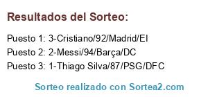 Lista de participantes: 1-Thiago Silva/87/PSG/DFC, 2-Messi/94/Barça/DC, 3-Cristiano/92/Madrid/EI.