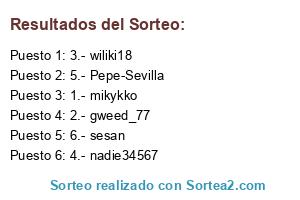 Lista de participantes: 1.- mikykko, 2.- gweed_77, 3.- wiliki18, 4.- nadie34567, 5.- Pepe-Sevilla, 6.- sesan.