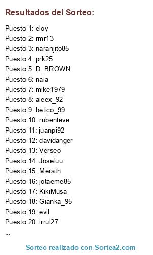 Lista de participantes: Merath, D. BROWN, rubenteve, betico_99, Joseluu, prk25, Gianka_95, jotaeme85, juanpi92, nala, KikiMusa, rmr13, irrul27, mike1979, Verseo, naranjito85, davidanger, sturlet, eloy, aleex_92, evil.