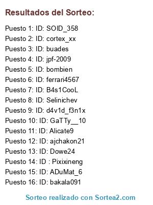 Lista de participantes: ID: Alicate9, ID: ferrari4567, ID: jpf-2009, ID: ajchakon21, ID: d4v1d_f3n1x, ID: bakala091, ID: Dowe24, ID: cortex_xx, ID: Selinichev, ID: B4s1CooL, ID: GaTTy__10, ID: SOID_358, ID: bombien, ID: ADuMat_6, ID : Pixixineng, ID: buades.