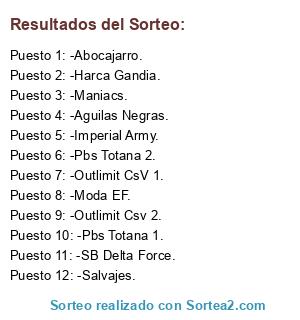 Lista de participantes: -Aguilas Negras., -Abocajarro., -Harca Gandia., -Imperial Army., -Maniacs., -Moda EF., -Outlimit CsV 1., -Outlimit Csv 2., -Pbs Totana 1., -Pbs Totana 2., -Salvajes., -SB Delta Force..
