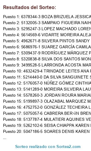 Lista de participantes: 6378344-3 BOZA BRIZUELA JESSICA MARIA , 5075057-6 CABRERA BER√ìN BRENDA RAFAELA , 5214440-0 DA SILVA SANGUINETE SIANY , 4752752-0 GONZÁLEZ TECHEIRA LEONARDO FELIPE , 5578260-3 JORDAN ROURA MARIANA , 3499528-5 LARRONDA ACOSTA MARISOL , 5295247-3 LOPEZ MACHADO LORENA , 5141289-0 MOREIRA SILVEIRA LAURA VANESA , 5137787-4 MULATIERI AQUINES VERONICA XIMENA , 5176057-0 NÚÑEZ GÓMEZ CINTHIA DANIELA , 4974276-0 ODRIOZOLA VAZQUEZ MARIA PIA , 5199897-3 OLAZABAL MARQUEZ MARIA FERNANDA , 4360755-0 REY RODRIGUEZ MARIA DEL LUJAN , 5309437-9 RODRÍGUEZ MÁRQUEZ PATRICIA EUGENIA , 5132005-3 SAMPAIO FIGUEIRA NAIHARA JIMENA , 5262102-6 SEISA CHIAPPA KAREN DANIELA , 5320838-8 SILVA DOS SANTOS MONICA GABRIELA , 4962671-8 SILVERA PINTOS SANDY ROMINA , 5047186-5 SOARES DENIS KAREN YULIANE , 5686976-1 SUAREZ GARCÍA CAMILA AGUSTINA , 4632429-4 TRINDADE LEITES ANA PAULA , 5614569-6 VIDARTE MOREIRA ALEJANDRA CAROLINA.
