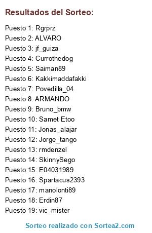 Lista de participantes: Bruno_bmw, Currothedog, vic_mister, Jonas_alajar, E04031989, manolonti89, Kakkimaddafakki, Rgrprz, SkinnySego, Povedilla_04, Saiman89, jf_guiza, Erdin87, Jorge_tango, Spartacus2393, rmdenzel, Samet Etoo, ARMANDO, ALVARO.