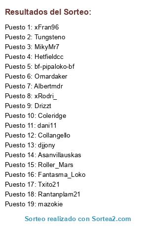 Lista de participantes: Roller_Mars, MikyMr7, mazokie, Hetfieldcc, Coleridge, Drizzt, Fantasma_Loko, Tungsteno, Txito21, Rantanplam21, Albertmdr, Asanvillauskas, Omardaker, dani11, bf-pipaloko-bf, xRodri_, xFran96, Collangello, djjony.