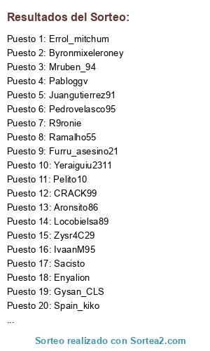 Lista de participantes: Pelito10, Yeraiguiu2311, J_murcia, Gysan_CLS, Pedrovelasco95, R9ronie, IvaanM95, Ramalho55, Facio7, Juangutierrez91, Pelizelli, BorjaRT13, Tanito226, Locobielsa89, Isma123i, Spain_kiko, Egimendia99, Jemi666, Furru_asesino21, Pabloggv, Santo04, Borarember, Errol_mitchum, Aronsito86, Sacisto, Stewiedm27, Peppuz07, Zysr4C29, Eliaasfernandez, Ankibusa, Arovira9, Enyalion, CRACK99, Byronmixeleroney, Mruben_94, Assasinstoto, Seve, RonMatusalem13, Otasola1, Fer_man-87.