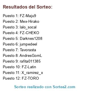 Lista de participantes: jumpedeel, Darknes1208, Tavorasta, rafita011385, FZ-Latin, lalo_socal, FZ-TORO, AndresGomL, FZ-Maju9, Mex-Hirako, FZ-CHEKO, X_ramirez_x.