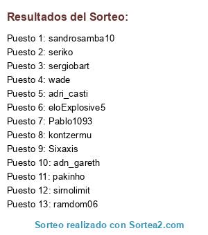 Lista de participantes: sirnolimit, adn_gareth, adri_casti, eloExplosive5, Pablo1093, Sixaxis, wade, sergiobart, seriko, ramdom06, sandrosamba10, kontzermu, pakinho.