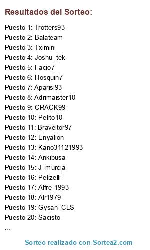 Lista de participantes: Alfre-1993, Jezh24, Adrimaister10, Joshu_tek, Aparisi93, Jonas_alajar, Balateam, Ankibusa, Gysan_CLS, Danieliyo, Sacisto, Facio7, J_murcia, Braveitor97, Hosquin7, Alr1979, CRACK99, Pelito10, Pelizelli, Jorgena87, Tximini, Enyalion, Kano31121993, Trotters93.