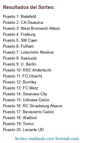 Lista de participantes: Benevento Calcio, Levante UD, Udinese Calcio, SM Caen, Fulham, Sassuolo, West Bromwich Albion, Swansea City, Lokomotiv Moskva, Torino, RSC Anderlecht, Burnley, Watford, Bielefeld, U. Berlin, Freiburg, RC Strasbourg Alsace, FC Utrecht, CA Osasuna, FC Metz.