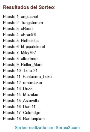 Lista de participantes: Coleridge, Drizzt, Txito-21, MikyMr7, Tungstenum, Hetfieldcc, anglachel, bf-pipaloko-bf, omardaker, Fantasma_Loko, Rantanplam, Roller_Mars, Asanvilla, albertmdr, Mazokie, Dani11, xRodri, xFran96.