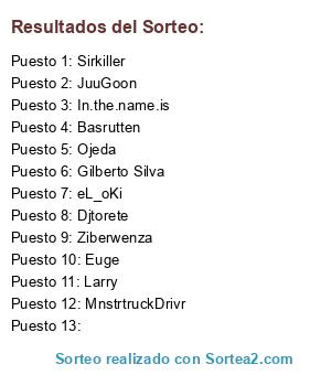 Lista de participantes: , JuuGoon, Basrutten, MnstrtruckDrivr, eL_oKi, Djtorete, Sirkiller, Ojeda, Larry, Euge, Ziberwenza, In.the.name.is, Gilberto Silva.