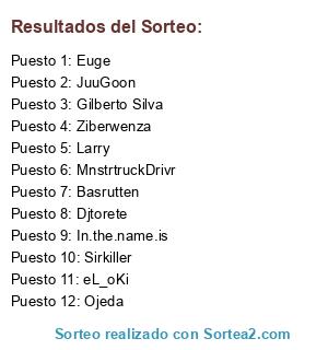 Lista de participantes: JuuGoon, Basrutten, MnstrtruckDrivr, eL_oKi, Djtorete, Sirkiller, Ojeda, Larry, Euge, Ziberwenza, In.the.name.is, Gilberto Silva.