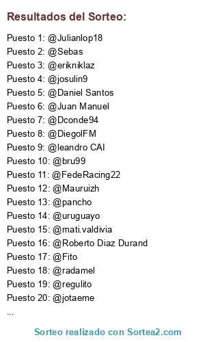 Lista de participantes: @FedeRacing22, @omarhuitron, @Daniel Santos, @leandro CAI, @leomaroni, @josulin9, @erikniklaz, @santiaguada12, @Julianlop18, @sergiolewis, @kikejimenez87, @Juan Manuel, @pablobare, @mati.valdivia, @DiegolFM, @Samuel Soler, @pancho, @jotaeme, @Mauruizh, @regulito, @bru99, @radamel, @Roberto Diaz Durand, @fernaeiou, @uruguayo, @Sebas, @Fito, @CaptainKidd, @Gabii05, @MalaSuerte, @LuisiTt, @Dconde94.